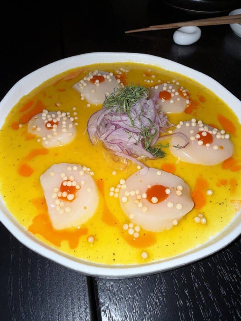 Wagyu dumplings with truffle aioli and sweet onion–black truffle salsa, perfectly crispy tuna, lobster, and salmon tacos on nori chips, and scallop tiradito with aji amarillo, a fun Japanese-Peruvian twist. King salmon carpaccio with truffle aioli and crispy onion. Everything was incredibly fresh and beautifully presented.