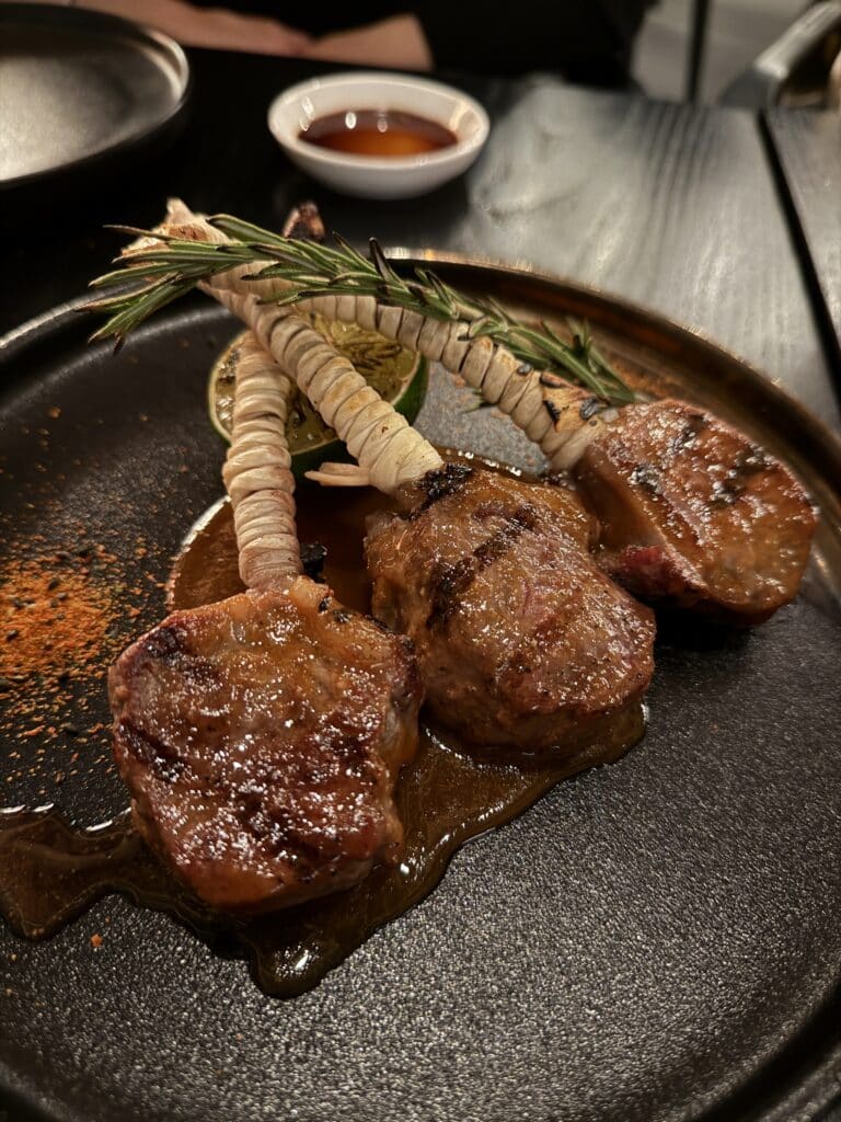 We started with cocktails, and Modan doesn’t play around. THE KING OF KAIJU is the sexiest drink I’ve had in a while. Smoky mezcal with a salt-tahini rim and Japanese seven-spice sesame seeds is the kind of drink you immediately want to reorder (and I did!). We also tried karaoke at night and an elevated espresso martini, smooth and not too sweet, while the lychee martini is bright and floral.