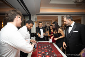 From the moment guests arrived, the atmosphere was electric—flowing champagne, elegant casino tables, and a whisper of secret-agent mystery set the stage for a night destined to be remembered. Attendees, many of the area’s most distinguished community leaders, stepped into a world of cosmopolitan elegance. The ladies, radiant in couture gowns, shimmered even brighter with exquisite diamonds courtesy of Helvetia Jewelry, lending an added sparkle to an already luminous evening.