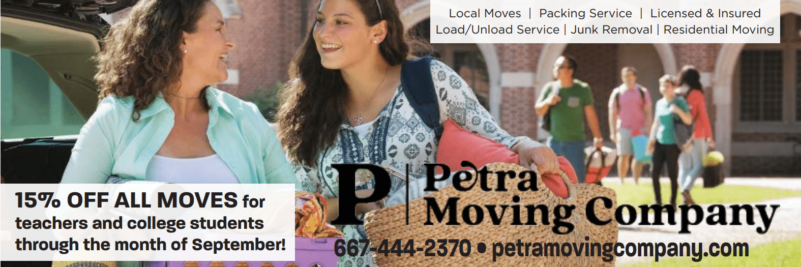 Petra Moving Company knows first-hand the stress of moving during this busy season. To help ensure your move is not only smooth, but budget-friendly, Petra Moving Company is offering 15% off moves for all teachers and college students.