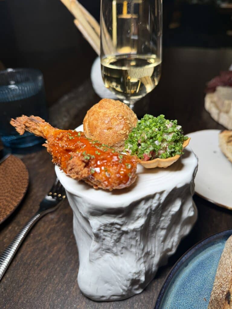 From the start, the kitchen signals ambition. The night started strong and a little playful. Among the opening bites was a potato millefeuille topped with Petrossian Ossetra caviar and house-made ranch. This was fun, indulgent, and surprisingly unfussy. Alongside it, Roseda Farms steak tartare on a lotus tartlet that was rich, a warm pimento cheese gougères tasted like someone actually cares about comfort food, and fried pufferfish with sorghum mambo sauce brought crunch, sweetness, and just enough personality to keep things interesting. It set the tone early: elevated, but not uptight.