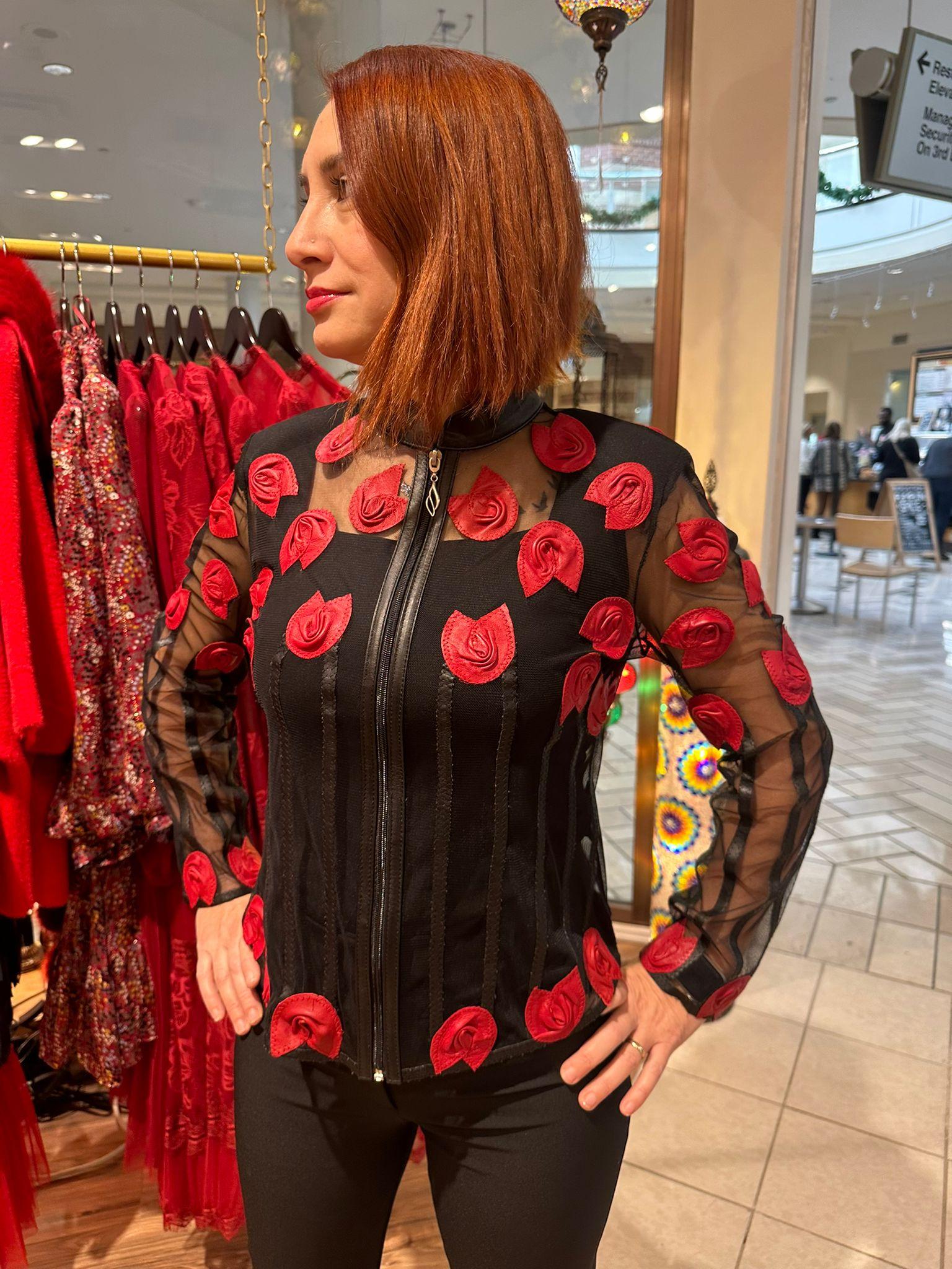 This eye-catching jacket is sure to turn heads when you walk in the door at any party. The tulle and leather hand made detail around really takes things to the next level.